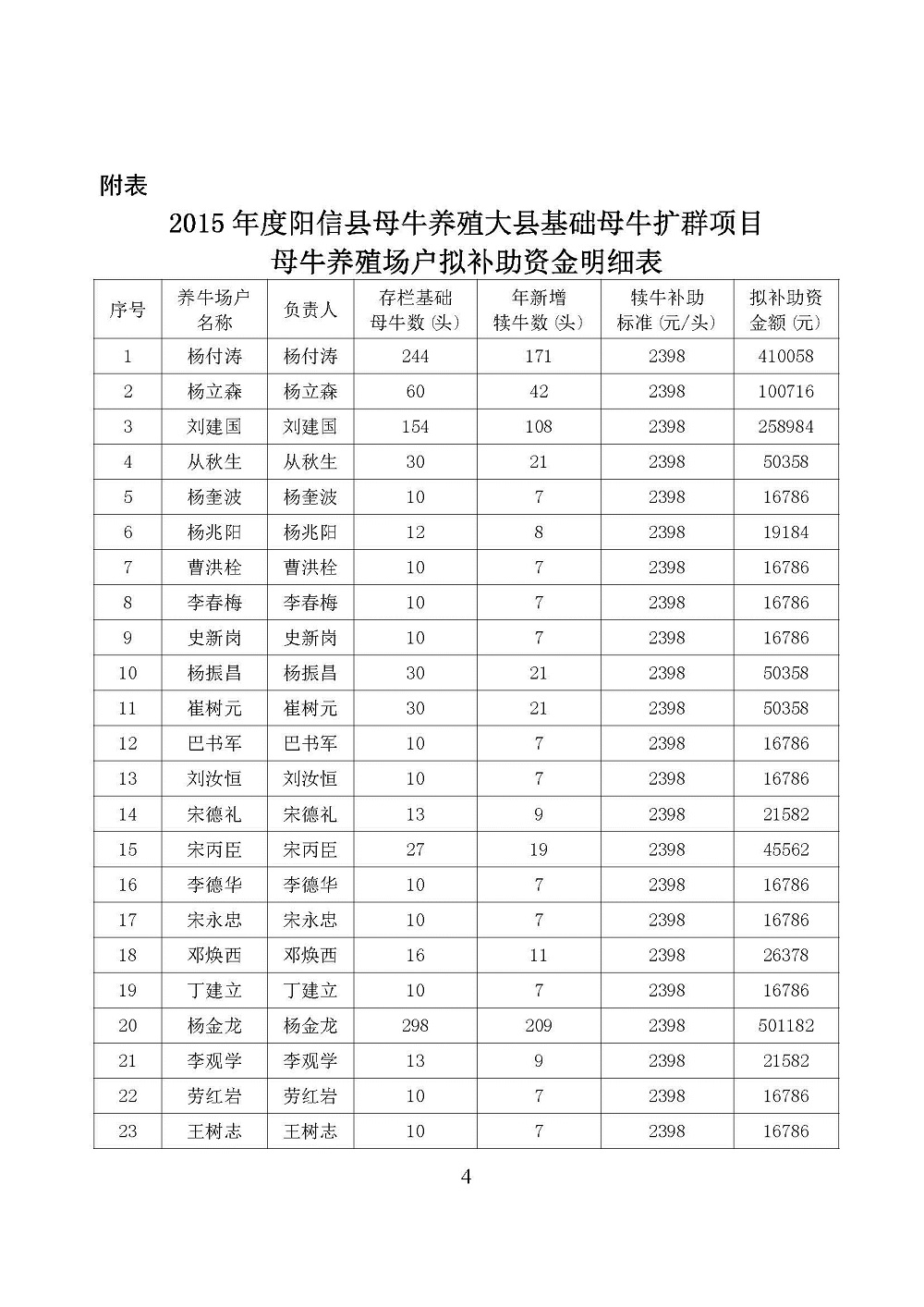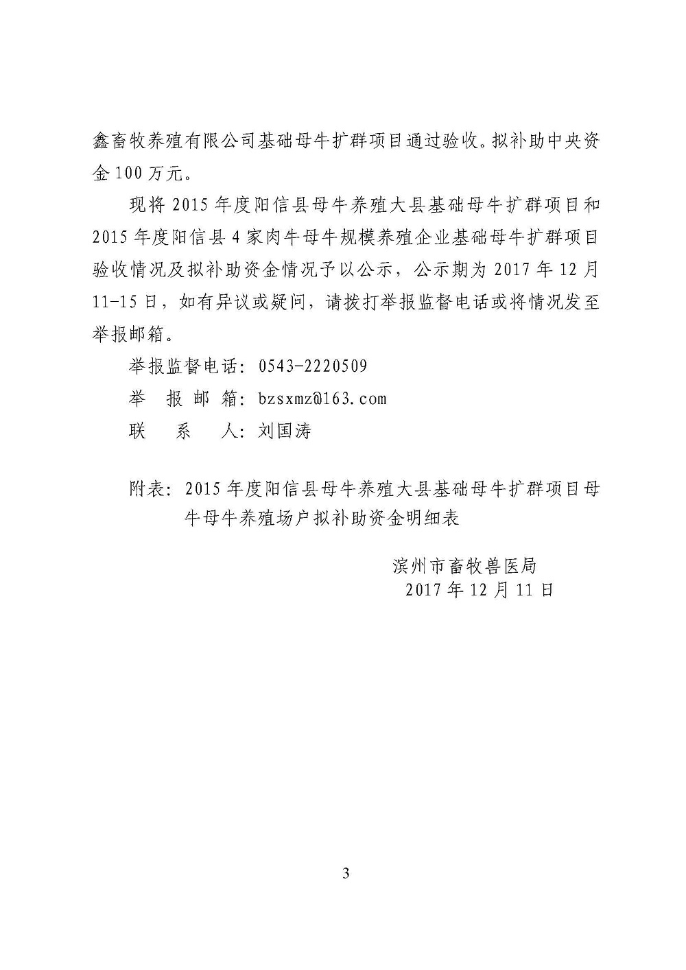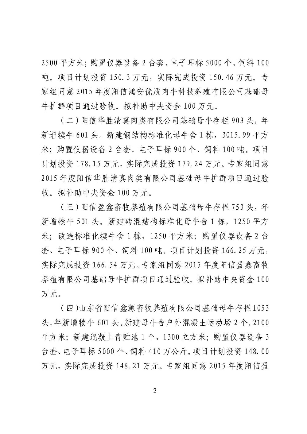 2015年度阳信县母牛养殖大县及4家规模企业拟补助资金情况公示