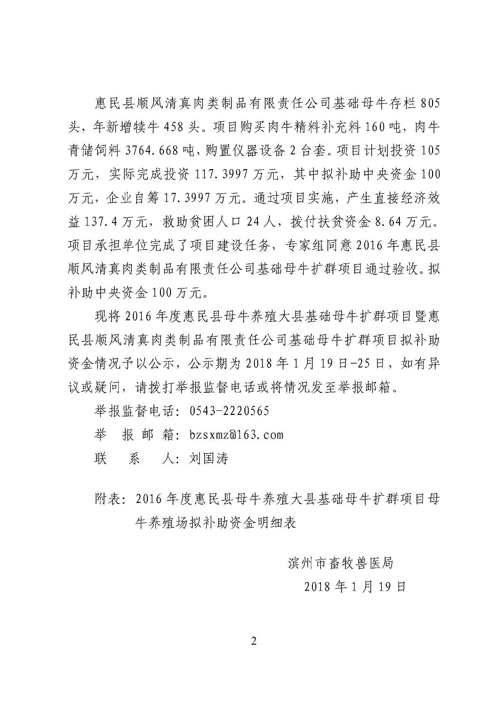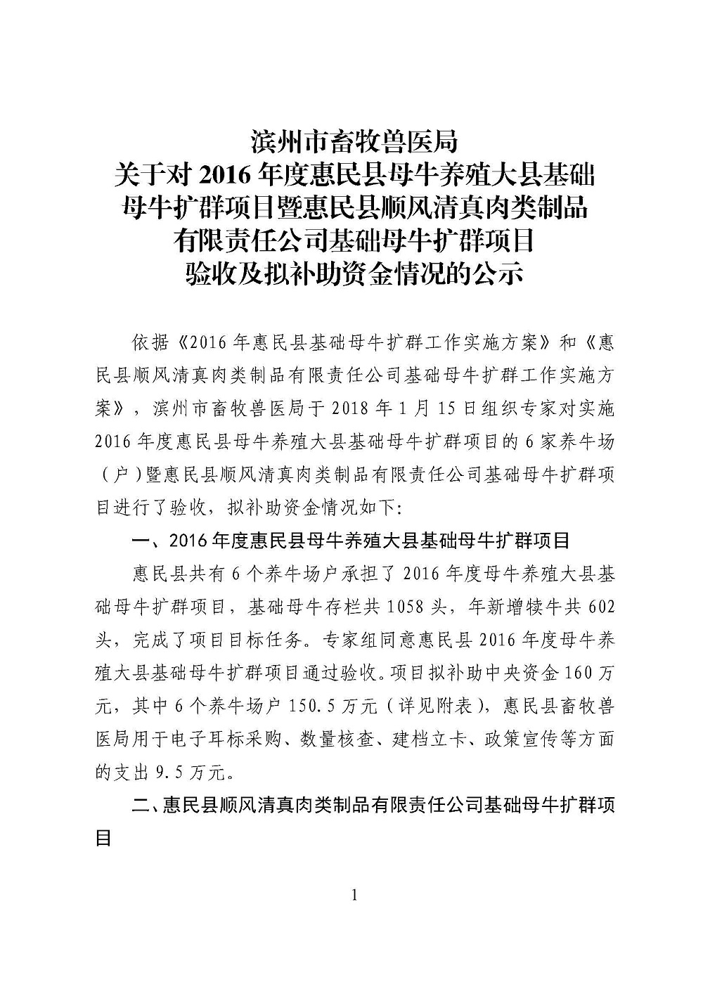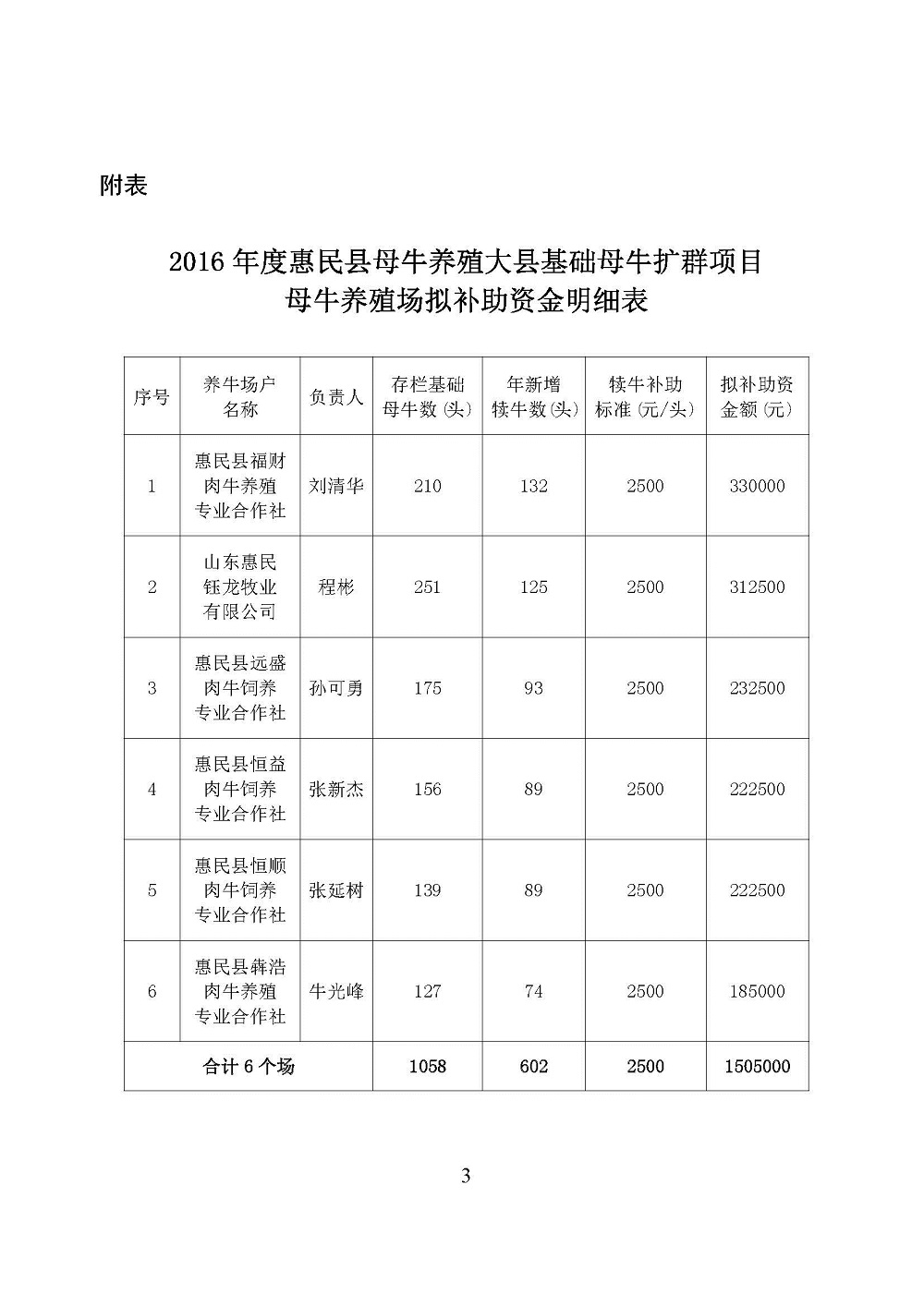 2016年度惠民县及顺风基础母牛项目拟补助资金情况公示