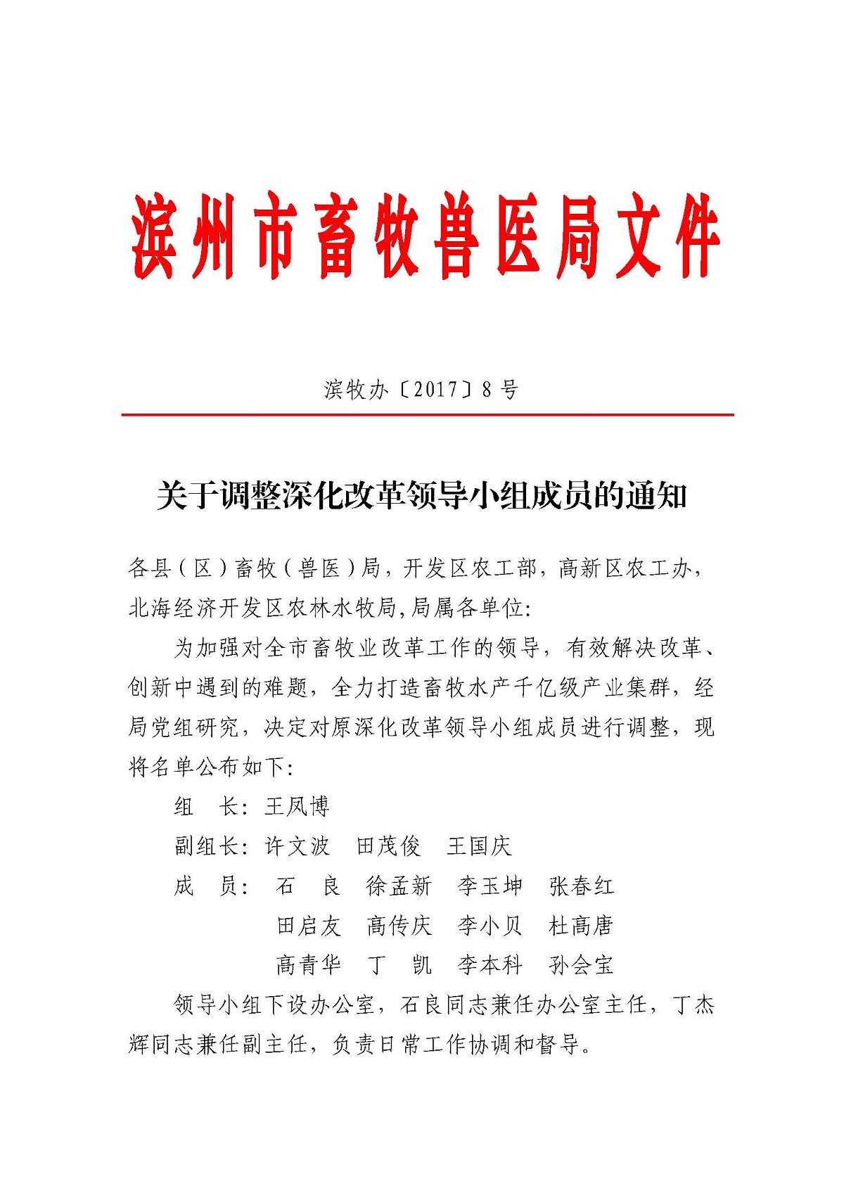 滨牧办〔2017〕8号 关于调整深化改革领导小组成员的通知